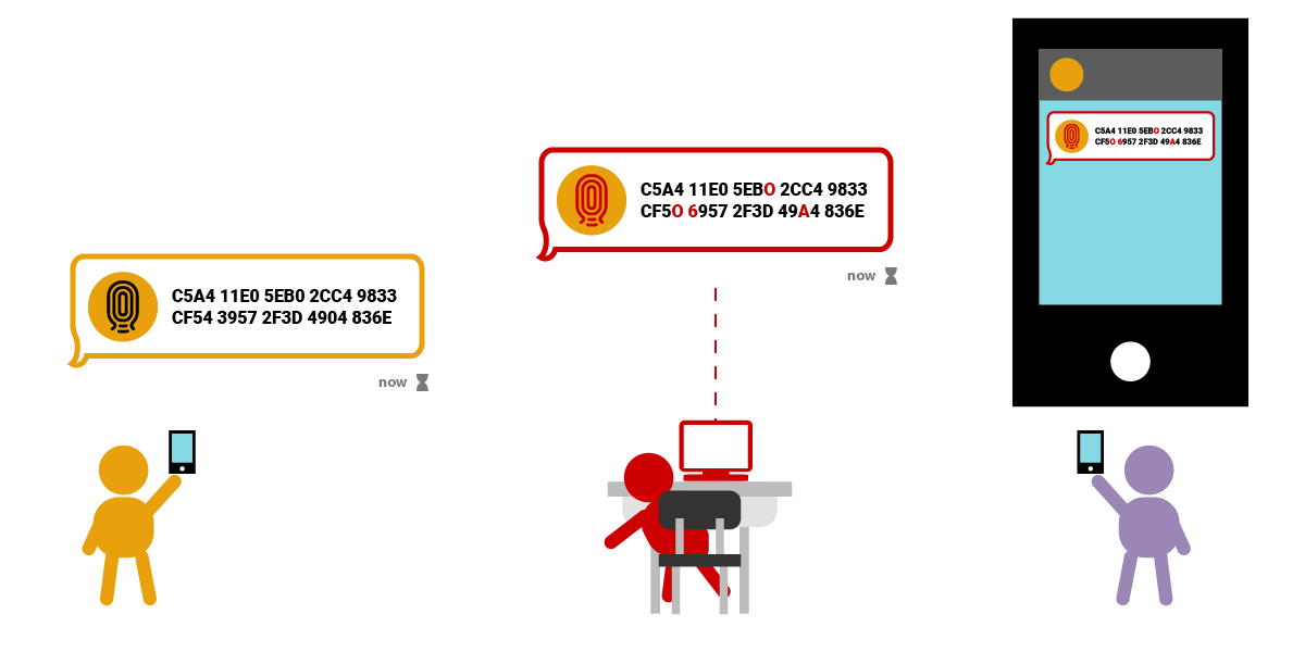စမတ်ဖုန်းတွေကိုင်ထားတဲ့ လူနှစ်ယောက်။ ဘယ်ဘက်လူက သူ့ရဲ့ အများသုံး စကားဝှက်သော့လက်ဗွေကို ချက်တင်ကနေ ပို့လိုက်ပါတယ်။ ညာဘက်လူဆီ မရောက်ခင်မှာပဲ အလယ်မှာရှိတဲ့ လူက ပေးပို့သူရဲ့ မက်ဆေ့ချ်ကို ကြားဖြတ်ယူပြီး လက်ဗွေမှာ ပါရှိတဲ့ ကိန်းဂဏန်းနဲ့စာလုံး အချို့ကို အပြောင်းအလဲလုပ် လိုက်ပါတယ်။ ပြီးတော့မှ ညာဘက်က လက်ခံသူ ဆီပို့ပေးလိုက်ပါတယ်။ ညာဘက်မှာ လက်ခံသူရဲ့ဖုန်းကို ပြထားပါတယ်။ မက်ဆေ့ချ်က မူလပေးပို့ သူဆီက လာသလိုထင်ရပေမယ့် တကယ်တမ်းကျတော့ ကြားလူရဲ့စနက်နဲ့ လိမ်ထားတဲ့ မက်ဆေ့ချ် အတုကြီးဖြစ်နေပါတယ်။ |